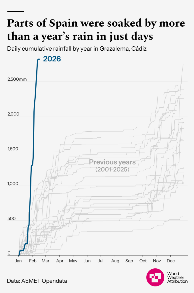 ‘In Grazalema, southern Spain, more than an entire year of expected rain fell in just a matter of days. Similarly, parts of Morocco and Portugal saw one-day rainfall totals during Storm Leonardo that are so extreme they would be expected at most once in a century.’