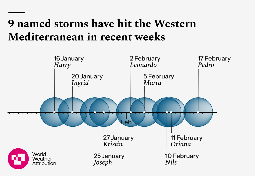 ‘Since 16 January, nine named storms have battered the Mediterranean region, bringing torrential rain and high winds that forced the evacuation of more than 12,400 people in Spain, 3000 people in Portugal and 300,000 people in Morocco.”